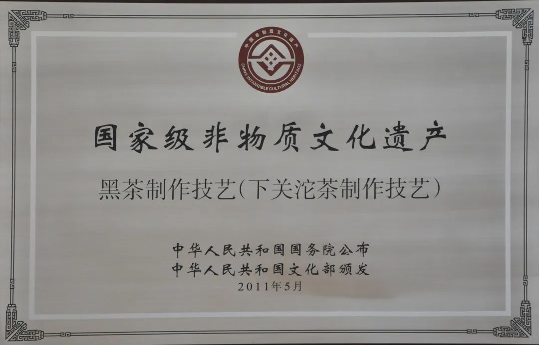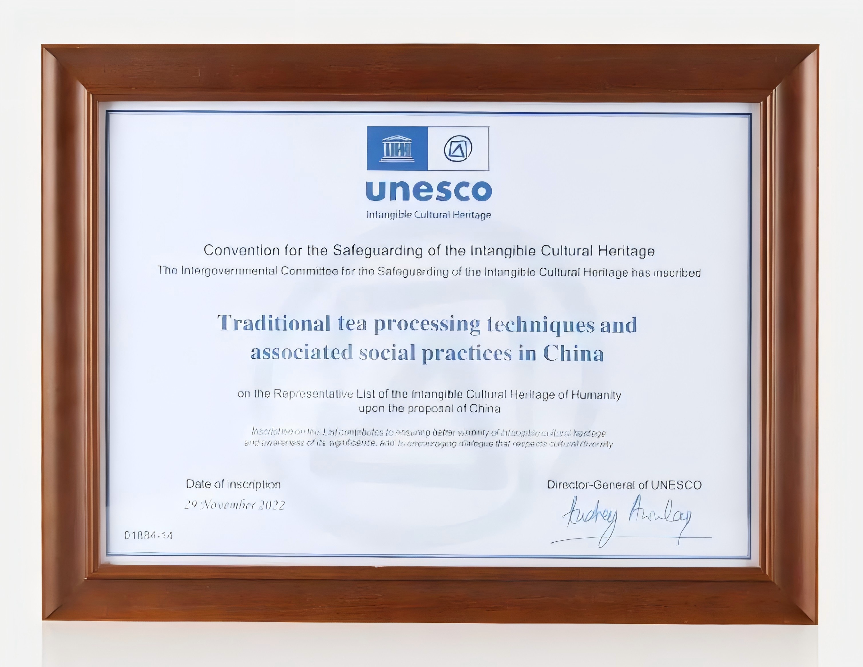 2022年11月29日聯合國教科文組織頒發的“中國傳統制茶技藝及其相關習俗”列入人類非物質文化遺產代表作名錄證書