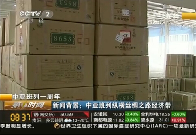 為配合中央的一帶一路戰(zhàn)略,中鐵總公司開行了中亞、中歐貨物班列。傳統(tǒng)的絲綢之路產(chǎn)品源源不斷出口到亞歐市場(chǎng),搭載到專列上的下關(guān)沱茶20周年版8653餅茶等茶在11月28日上午,中央2臺(tái)《第一時(shí)間》欄目中特寫播出。