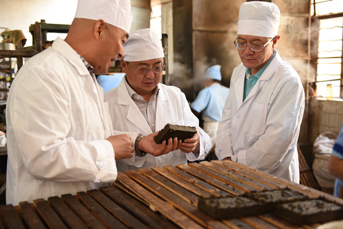 龍志剛(左二)帶隊(duì)的拉薩市考察團(tuán)一行在下關(guān)沱茶公司總經(jīng)理陳國(guó)風(fēng)(左一)陪同下參觀下關(guān)沱茶生產(chǎn)車(chē)間