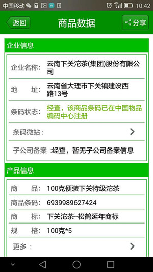 通過以上方式進行我公司產品的條形碼查詢,消費者可以得到產品條碼所對應的該產品的標準簡稱、規格、商標、公司地址等信息。