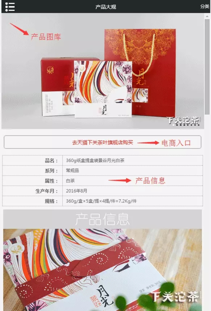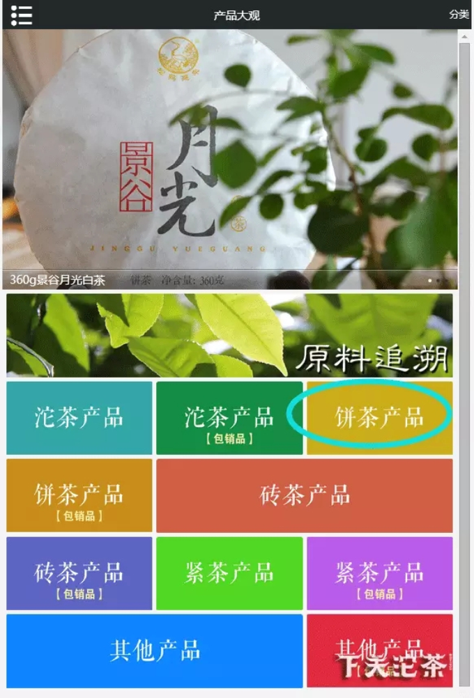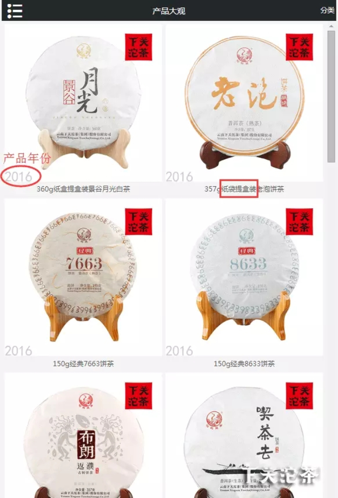 以“餅茶產(chǎn)品”為例點(diǎn)擊進(jìn)入,可以看到餅茶產(chǎn)品的目錄。由于該網(wǎng)站從2016年1月1日起正式開通,因此,從2016年度以后生產(chǎn)的產(chǎn)品均可以在封面圖片的左下角看到該產(chǎn)品的年份。而在產(chǎn)品名稱上,也可以快速了解到該產(chǎn)品的包裝形式:如紙盒提盒裝、布袋提盒裝等,說明該產(chǎn)品包裝形式是單片放置在一個(gè)盒子,幾盒放作一提,如景谷月光白茶;或者幾片放置在一個(gè)布袋里,一袋放作一提,如金雀。