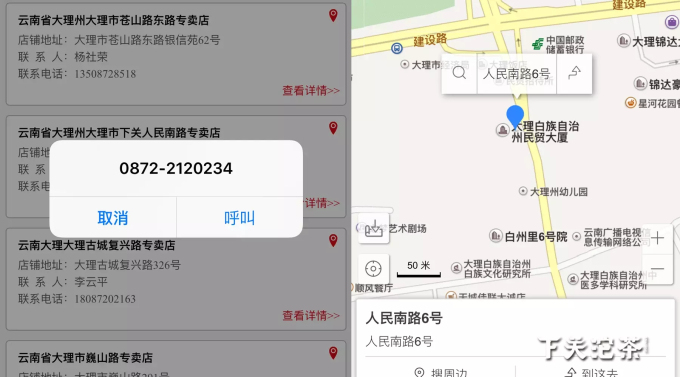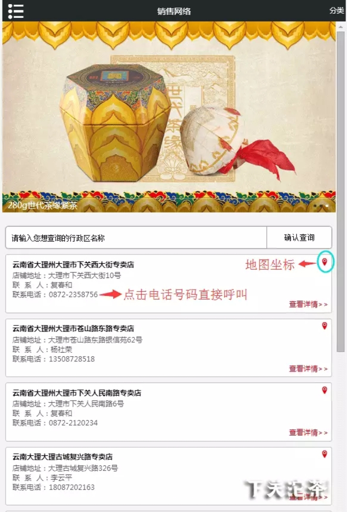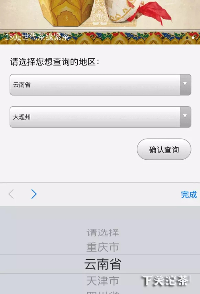 如要查詢?cè)颇洗罄淼南玛P(guān)沱茶專賣店,可以在“省份”一欄滑動(dòng)查找“云南省”,在下一級(jí)地市目錄中查找“大理州”,點(diǎn)擊“確認(rèn)查詢”,即可看到大理地區(qū)的所有下關(guān)沱茶專賣店。