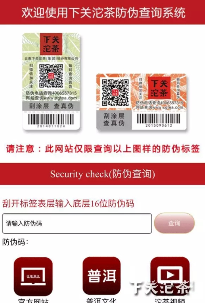 產(chǎn)品驗(yàn)真頁面僅支持貼有“下關(guān)沱茶食品安全可追溯標(biāo)簽”的查詢。由于公司產(chǎn)品現(xiàn)階段有兩類標(biāo)簽,一為“食品安全可追溯標(biāo)簽”,一為“國(guó)家地理標(biāo)志保護(hù)產(chǎn)品防偽標(biāo)簽”,不少茶友常用該頁面查詢“國(guó)家地理標(biāo)志保護(hù)產(chǎn)品防偽標(biāo)簽”,因此查詢失敗,所以在這里,小編要提醒各位茶友,該頁面僅支持查詢貼有“下關(guān)沱茶食品安全可追溯標(biāo)簽”的產(chǎn)品。在查詢頁面,也有該標(biāo)簽的圖樣信息。