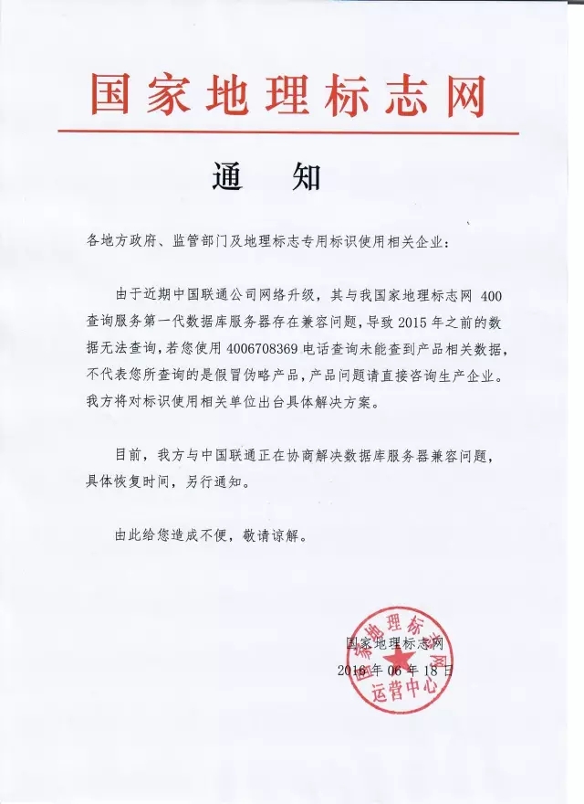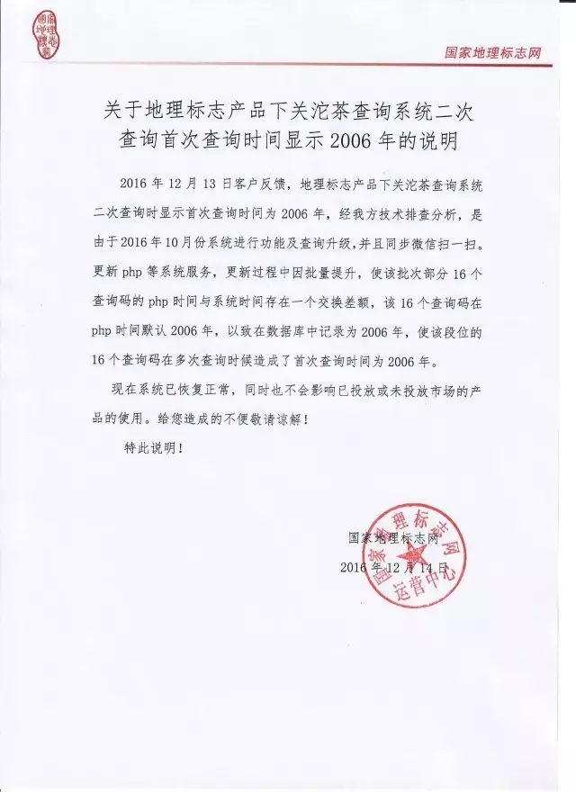 2016年12月,公司接到部分茶友反饋,二次查詢地理標志防偽標簽顯示首次查詢時間為2006年的情況。經(jīng)過公司與國家地理標志網(wǎng)運營中心取得聯(lián)系并排查后發(fā)現(xiàn),后臺數(shù)據(jù)出現(xiàn)異常情況,并已經(jīng)及時修正,針對這一情況,國家地理標志網(wǎng)發(fā)出通知如下: