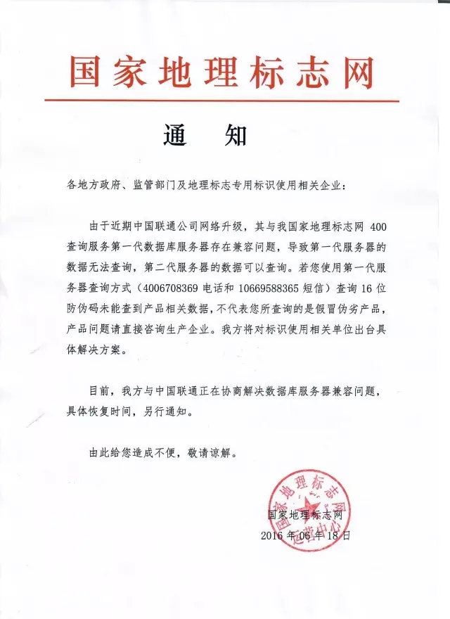 2016年6月18日,國家地理標志網(wǎng)發(fā)布了兩份通知,告知廣大茶友該防偽標簽查詢系統(tǒng)數(shù)據(jù)庫兼容問題以及聲訊電話查詢不到產(chǎn)品信息的問題,通知指出,由于數(shù)據(jù)庫兼容問題,導(dǎo)致該標簽16位防偽碼查詢不到相關(guān)數(shù)據(jù)。而廣大茶友遇到的標簽查詢不了的問題也基本屬于這種情況。