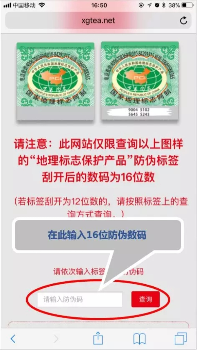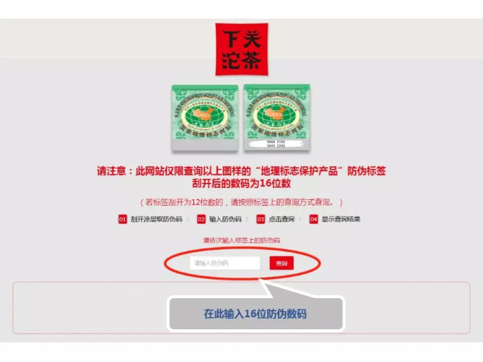 (1)系統(tǒng)僅支持16位數(shù)碼的“地理標志防偽標簽”查詢。刮開“地理標志防偽標簽”為12位數(shù)碼的,請按照標簽上方公布的查詢方式查詢。