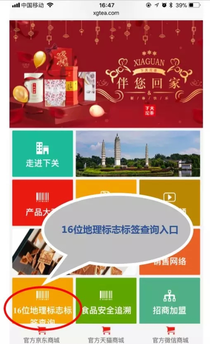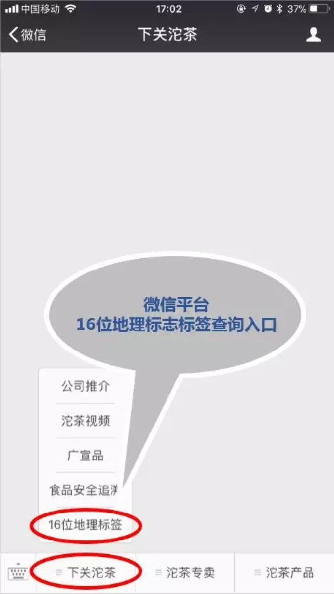 ②關注公眾號后進入公眾號,在公眾號底部的菜單欄中點擊菜單“下關沱茶”里的“16位地理標簽”菜單,進入查詢頁面。