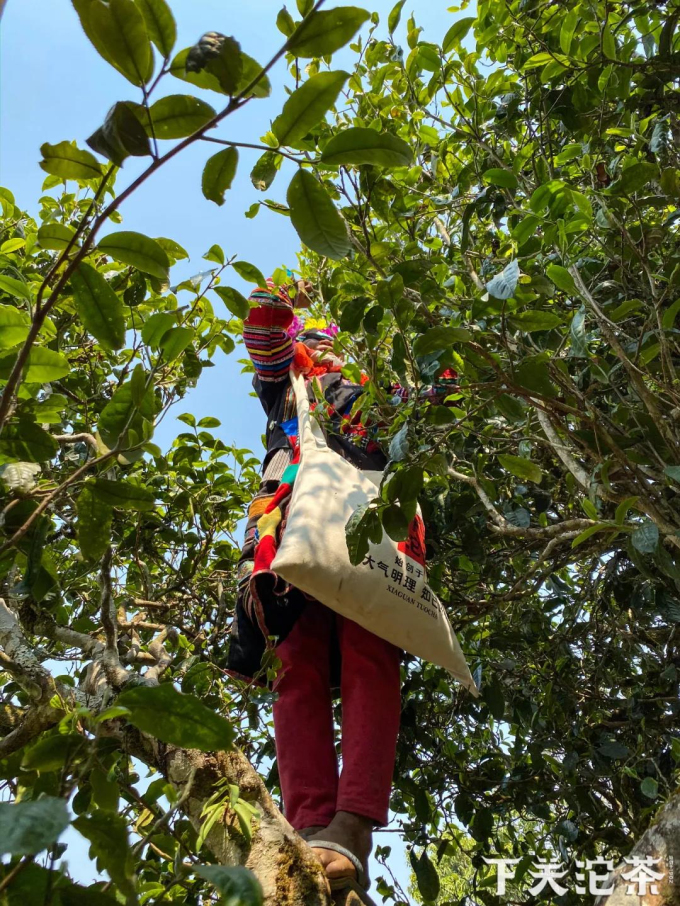 初見譚大哥時,他正背著公司為當地茶農專門定制的采茶挎包在古茶樹上采茶。公司在多年前選購勐宋鄉的茶葉時,發現茶農們為了方便,用編織袋直接縫成挎包在采茶時使用。