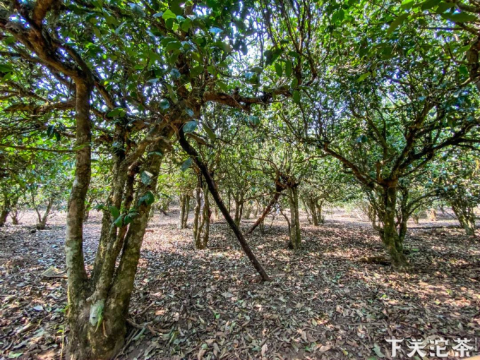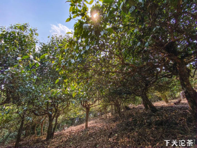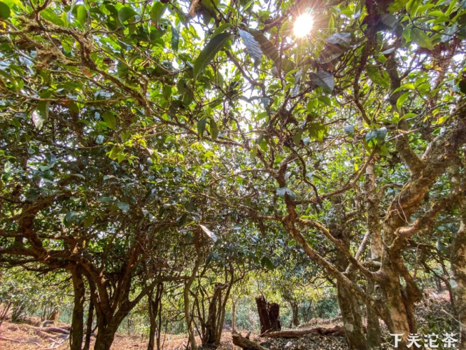 在海拔2100多米的古茶園里,沁人心脾的山風陣陣吹拂,儼然是一番與山腳不同的自然景象。鑒茶團隊一行走進面積約4000畝的古樹茶林里,便被這里良好的自然生態(tài)和成片生長的古樹茶所震撼。