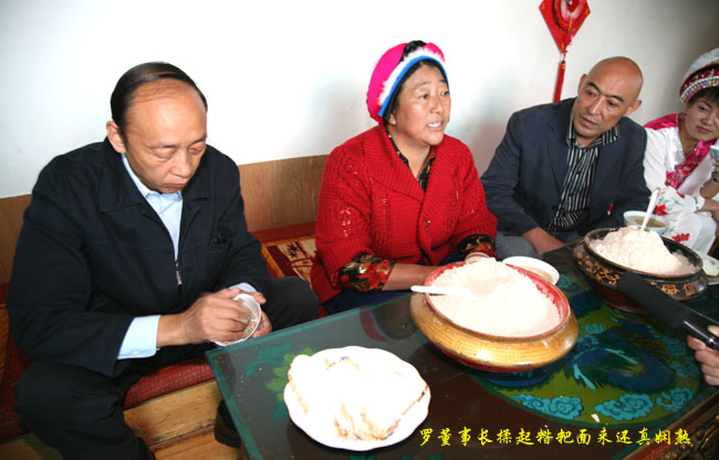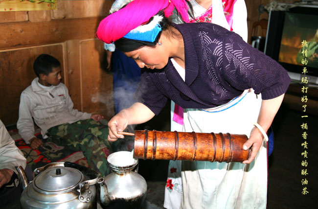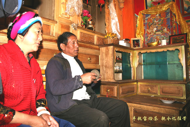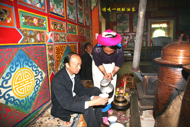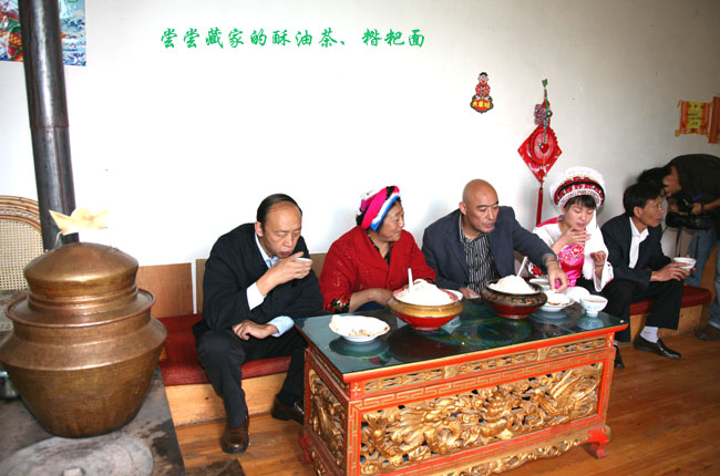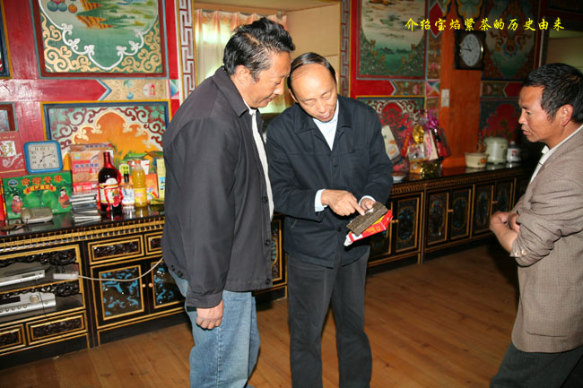 臨近迪慶建州50周年前夕的藏區,家家戶戶都充滿一派節日喜慶的氣氛,羅董事長、陳總經理一行的到來,更讓藏民臉上顯得喜氣洋洋。在藏民西康達家和扎巴家,羅董事長、陳總經理分別向他們贈送了禮茶,熱情好客的藏民給客人端上了熱氣騰騰的酥油茶,擺上了藏家最有特色的糌粑面和奶渣,賓主互致扎西德勒,促膝交談,暢敘以“寶焰”緊茶為紐帶維系起的世代茶緣。在交談中,話題始終圍繞著藏民從祖輩上就一直飲用的寶焰緊茶。藏區有句民諺:“寧可三日無糧,不可一日無茶”。下關緊茶銷往藏區已有上百年的歷史,“寶焰”牌是上世紀三十年代就創立的商標,在迪慶藏區,寶焰下關緊茶可以說是無人不知、無人不曉。交談中公司領導還認真征求了藏民對邊銷茶產品的意見,表示今后要更好地完成好邊銷茶生產任務,以自己的行動續寫下關沱茶集團公司與迪慶藏族自治州之間的世代茶緣。