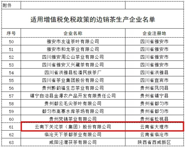 下關沱茶集團公司在布告附件:適用增值稅免稅政策的邊銷茶生產企業名單之列。