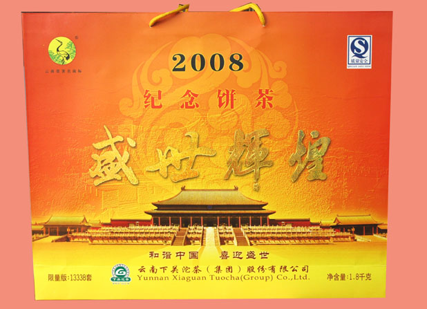風花雪月地,銀蒼玉洱茶。下關沱茶集團公司最近出品的“盛世輝煌”紀念禮茶,選用云南大葉種之高檔曬青茶為原料,按傳統配方拼配,充分利用“下關風”特有的干燥作用和“蒼山雪”天然礦泉水優勢,經蒸揉,殺菌等現代工藝制成,香氣馥郁,濃厚持久,湯色橙黃明亮,滋味醇爽回甘,飲之清涼解渴,幫助消化,祛除疲勞,心曠神怡。此款禮茶僅限量生產13338套,是中秋佳節品飲、送禮、典藏之佳茗。